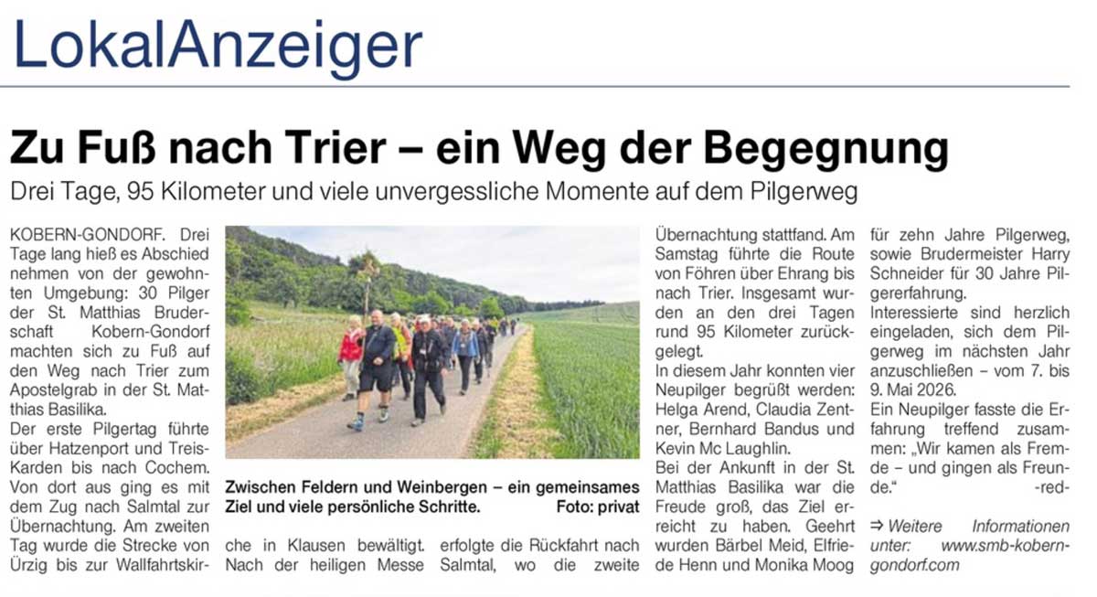 Die St. Matthiasbruderschaft Kobern-Gondorf versteht sich nicht als Verein, sondern als Pilgerbruderschaft für die Wallfahrt zum Apostelgrab nach Trier und für die Sorge um die Matthiaskapelle.